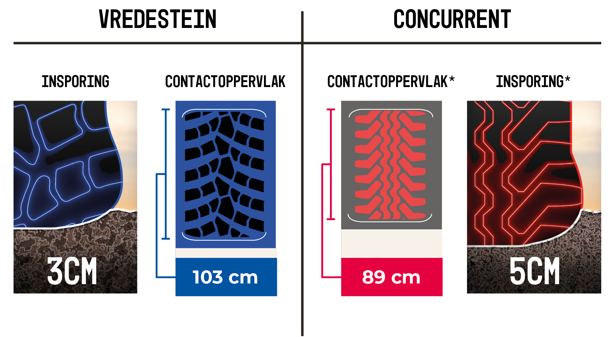 Volgens tests uitgevoerd door DLG in het veld, vergeleken met een concurrent VF-band. Geteste banden VF 750/60 R 30.5 met 7.100 kg belasting en bandenspanning aangepast voor maximaal 10 km/u veldwerk (1.0 bar).